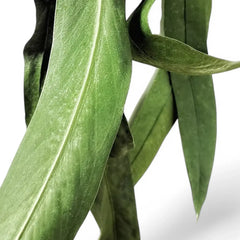 Anthurium vittarifolium lebt ganz von Linie, Länge und Bewegung und bildet lange riemenartige Blätter, die elegant aus Ampeln, Regalen oder montierten Arrangements herabhängen.