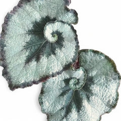 Begonia rex 'Escargot' ist die Spiral-Rex, an der viele andere gemessen werden: Jedes Blatt rollt sich an der Basis wie ein Schneckenhaus ein und verbindet silbrig-grüne Zonen mit tief dunklen Waldrändern. Die Geometrie ist so stark, dass Begonia rex 'Escargot' selbst ohne große Blattmasse skulptural wirkt – genau deshalb bleibt sie unter Sammlern so verlässlich beliebt.