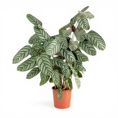 Ctenanthe setosa 'Compactstar' ist eine kompakte, aufrecht wachsende Sorte mit silbrig grün gezeichneten Blättern, dunklem Fischgrätenmuster und purpurfarbenen Unterseiten, die im Tagesverlauf immer wieder sichtbar werden. Mit meist etwa 40–50 cm Höhe bringt sie die Wirkung größerer Marantengewächse in ein handlicheres Format, das gut auf Regale, Beistelltische oder in Pflanzengruppen passt.