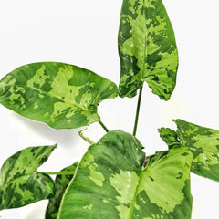 Schismatoglottis sp. 02 mit limettengrünen Sprenkeln trägt dunklere grüne Blätter, die mit frischen limettengrünen Flecken und Aufhellungen überzogen sind und dadurch lebendiger und malerischer wirken als die eher ruhig gezeichneten Formen der Gattung. Sie bleibt kompakt und horstig und passt dadurch gut in Terrarien, Vitrinen und kleinere Töpfe, in denen das lebendige Muster aus der Nähe gut gelesen werden kann.
