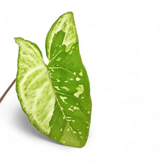 Syngonium podophyllum 'Panda' zeigt Panaschierung in Silber, Creme und Grün statt harter weißer Blöcke und wirkt dadurch ruhiger, aber trotzdem klar gemustert. Die Pflanze wächst mäßig schnell und kann als hängender Akzent oder als Kletterer kultiviert werden; mit Zeit und regelmäßigem Rückschnitt erreicht sie im Zimmer etwa 90 cm.