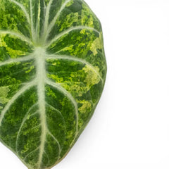 Alocasia 'Ninja Tricolor' bringt Sammlerwirkung in kompaktem Format. Ihre dunkel olivgrünen bis fast anthrazitfarbenen Blätter sind unregelmäßig mit Creme, hellem Grün und zartem Weiß gezeichnet, wodurch die Pflanze nie gleichförmig wirkt. Aus der Nähe fallen der seidige Schimmer und die klaren Blattadern besonders auf. Sie wächst eher langsam und eignet sich für helle Plätze mit gleichmäßiger Wärme sowie ein luftiges Substrat, das leicht feucht bleibt, ohne zu verdichten. Statt schnell an Größe zuzulegen, überzeugt sie durch Blattqualität, Musterung und eine kompakte, aufgeräumte Form. Besonders gut kommt sie an einem Platz zur Geltung, an dem ihre Blätter auf Augenhöhe gesehen werden können und nicht zwischen größeren Pflanzen untergehen.