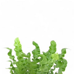 Asplenium nidus 'Crispy Wave' verdichtet den vertrauten Vogelnestfarn zu einer kompakten aufrechten Rosette aus schmalen, stark gewellten Wedeln. Gerade diese straffere Form macht ihn ideal für kleinere Regale oder gruppierte Pflanzungen, in denen ein klassischer Nestfarn schnell zu breit wirken würde.