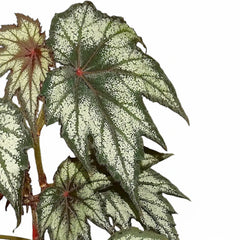 Begonia 'Little Brother Montgomery' trägt sternförmige Blätter mit silbrigem Grund und bronzigrüner Aderung, wodurch eine fein strukturierte Oberfläche entsteht, die komplex wirkt, ohne optisch unruhig zu werden. Die Pflanze wächst auf aufrechten, rohrartigen Trieben, bleibt aber relativ kompakt und passt daher gut auf Regale oder Tische, an denen die Blattzeichnung aus der Nähe sichtbar bleibt.