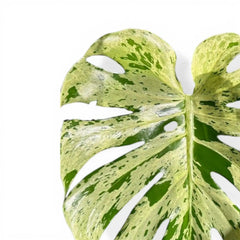 Monstera deliciosa 'Bulbasaur' verbindet die kräftige Kletterform von Monstera deliciosa mit einer ungewöhnlich weichen, unregelmäßigen Panaschierung. Statt klarer heller Felder zeigen die Blätter meist gemischte Zonen aus dunklem Grün, helleren Grüntönen und Creme, die mal wolkig, mal gesprenkelt, mal fast tarnartig wirken. Junge Pflanzen erscheinen oft noch zurückhaltend, doch mit viel Helligkeit,