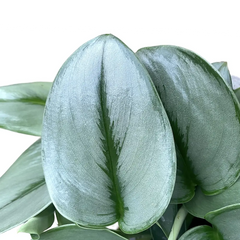Scindapsus treubii 'Moonlight' presents each leaf as a cool silver-green panel with darker margins, giving the plant a sleek metallic look without the busier patterning of pictus forms. Because growth is slower and leaves are thicker, it feels more architectural than many trailing aroids and suits minimalist interiors very well. On a pole, trellis, or shelf, it gives strong foliage contrast while remaining easy to style around other plants.