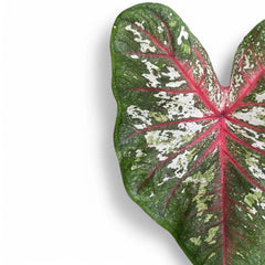 Caladium 'Tapestry' carries white-centred leaves edged in dark green and traced with fine burgundy-red veins, giving each blade a more detailed, hand-drawn look than caladiums with broader patches of colour. It usually grows to around 50–60 cm tall and wide during active growth, emerging from tubers into a compact upright clump.