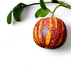 Citrus 'Arcobal' is a collector citrus whose striped red-orange fruits bridge the flavour of sweet blood orange and floral Meyer lemon, turning a compact potted tree into both a talking point and a genuinely useful kitchen asset.