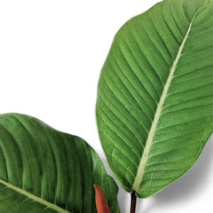 Philodendron geniculatum (often sold as 'Jet Streak') is defined by its thick, pale midrib and strongly parallel side veins marching through each elliptic leaf. It’s a tidy but characterful climber for anyone who likes strong linear venation.