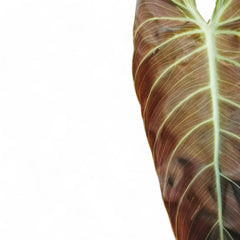 Philodendron melanochrysum is a classic velvet climber with long heart-shaped leaves that open bronze or copper and then darken to deep green with a golden cast along the veins. It is not just a pretty juvenile plant: once it is fixed to a tall damp pole, leaf size increases dramatically and mature foliage can exceed a metre indoors. The species wants support, not a hanging basket, because vertical growth is what unlocks its real form.