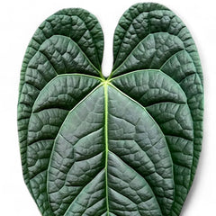 Anthurium magnificum Ă— luxurians combines broad velvet influence with deep bullation, creating leaves that feel armoured, weighty, and unusually three-dimensional. This hybrid stays more compact in height than its visual impact suggests, but every mature leaf carries enough texture and tonal depth to function as a focal point on its own.