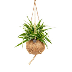 Chlorophytum comosum 'Ocean' in Kokodama combines a compact spider plant cultivar with a ready-styled coconut-fiber planter, so it feels more like a finished design piece than a standard young houseplant. The dense rosette of green leaves with creamy margins stays tidy and structured, while the natural Kokodama adds texture without visual bulk. That makes this version especially good for desks, shelves, small tables, and gift situations where you want something easy to place straight away.
