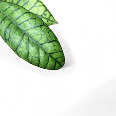 Hoya callistophylla 'Kalimantan' is a foliage-led clone with thick elongated leaves, dark reticulate veins, and a subtly bullate surface that gives the plant strong structure even when the vine is not in bloom. Compared with softer-leaved Hoyas, the Kalimantan form reads more architectural because the leaf tissue is firmer and the venation stands out sharply against the paler background.